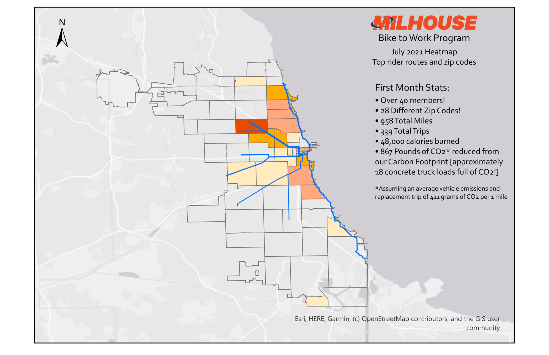 Milhouse Green kicked off their first initiative – the Bike to Work program – with a bang on June 28th! The program reimburses members $1 for every mile they bike for their commute as a thanks for reducing our collective carbon footprint. Other perks of the program include raffles for free bike gear, socials, breakfasts, free Divvy membership, free gym access, and a prize bike given to the member with the highest mileage at the end of the year. Over 40 team members have joined and in just one month, almost 1,000 miles have already been logged. This equates to 18 cement trucks full of CO2 emissions eliminated by not driving!