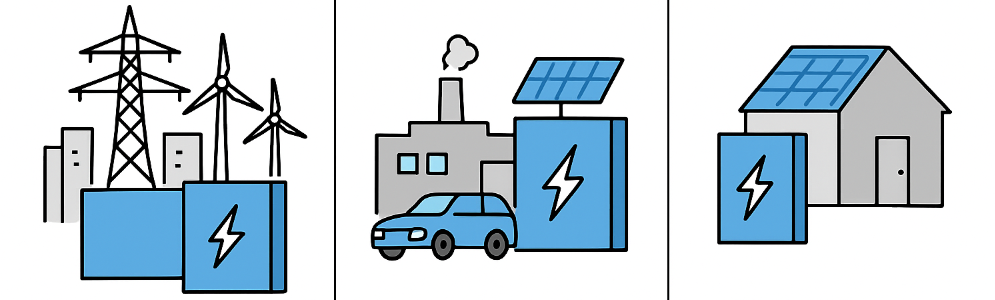 | Large-scale installations (over 10 megawatt-hours) are used to directly support utility operations. | Medium-scale systems (30 kilowatt-hours to 10 megawatt-hours) that help businesses integrate renewables, maintain backup power, and support EV charging. | Smaller systems (under 30 kilowatt-hours) give homeowners flexibility in sourcing their energy and powering their homes. |